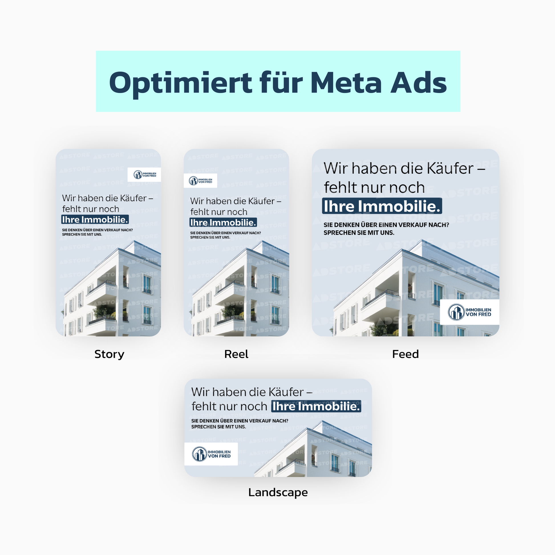 Nach dem Erwerb erhalten Sie insgesamt vier individualisierte Assets in verschiedenen Formaten, die speziell für den Bereich Immobilien und den Einsatz in Meta Ads konzipiert und langjährig erprobt wurden. Mit dem Anzeigen-Set decken Sie alle gängigen Platzierungen in den sozialen Medien ab.