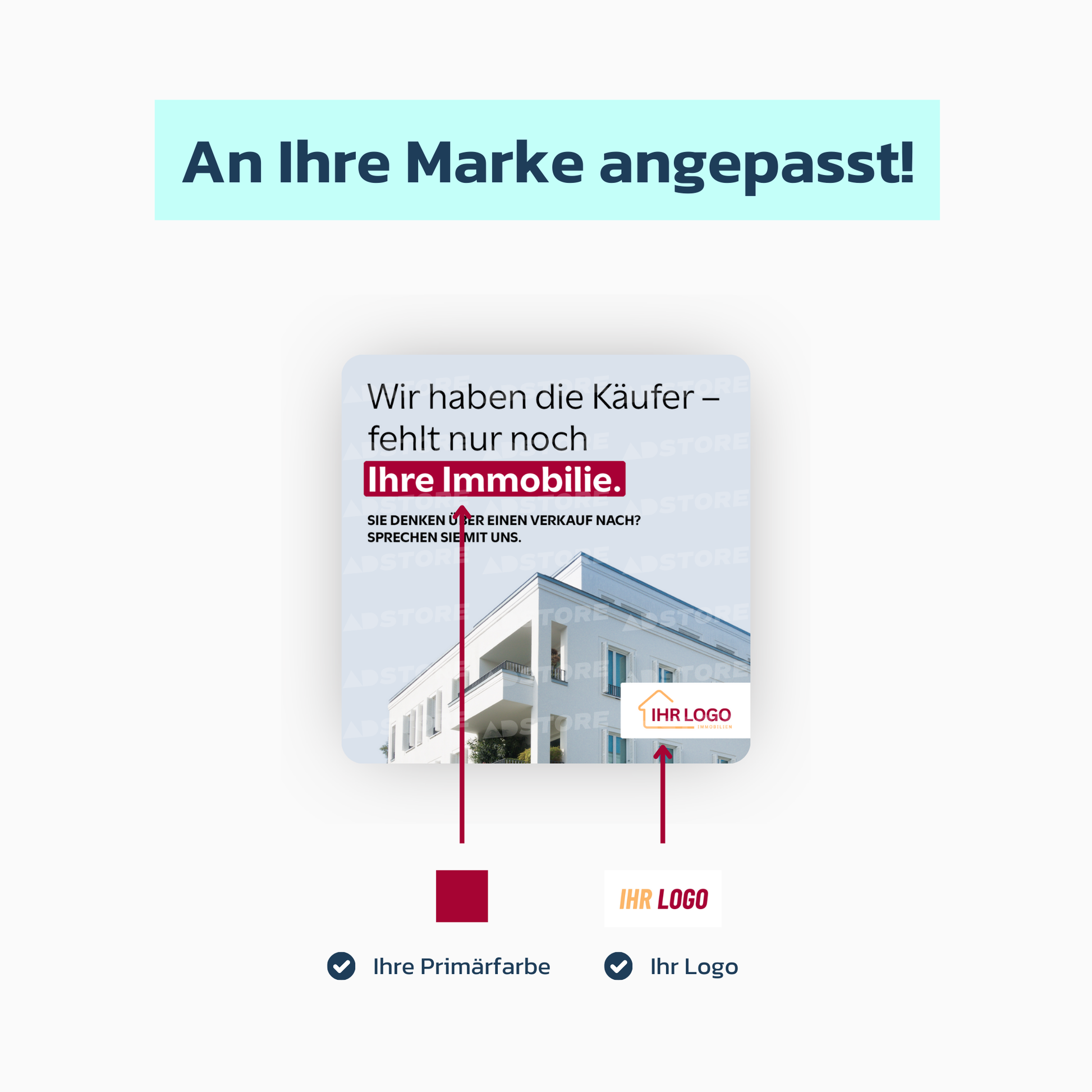 Mit der visuellen Gestaltung einer modernen Immobilie und der deutlichen Hervorhebung des individuellen Anpassungspotenzials (Primärfarbe & Logo) bieten wir Ihnen eine hochwertige Anzeige für Meta Ads. Besonders geeignet ist diese Anzeige für Makler, die aktiv nach neuen Verkaufsmandaten suchen, indem sie Eigentümer direkt ansprechen und die Entscheidungsfindung beschleunigen.