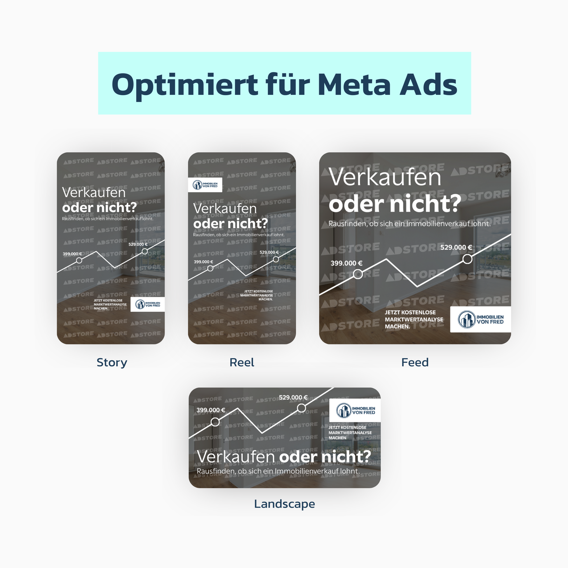Nach dem Erwerb erhalten Sie insgesamt vier individualisierte Assets in verschiedenen Formaten, die speziell für den Bereich Immobilien und den Einsatz in Meta Ads konzipiert und langjährig erprobt wurden. Mit dem Anzeigen-Set decken Sie alle gängigen Platzierungen in den sozialen Medien ab.